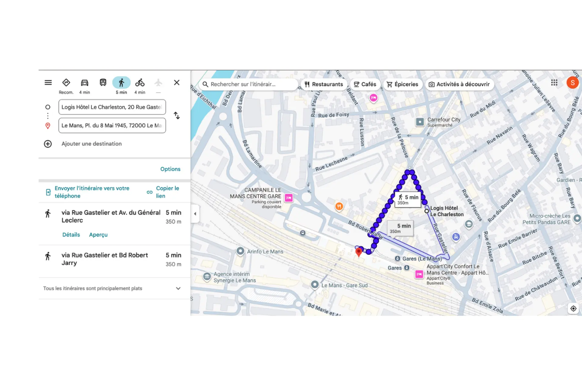 L’Hôtel Le Charleston bénéficie d’un emplacement particulièrement avantageux pour tous ceux qui arrivent ou partent en train. Il se trouve à seulement 350 mètres de la gare SNCF du Mans – ce qui représente environ 5 minutes de marche.